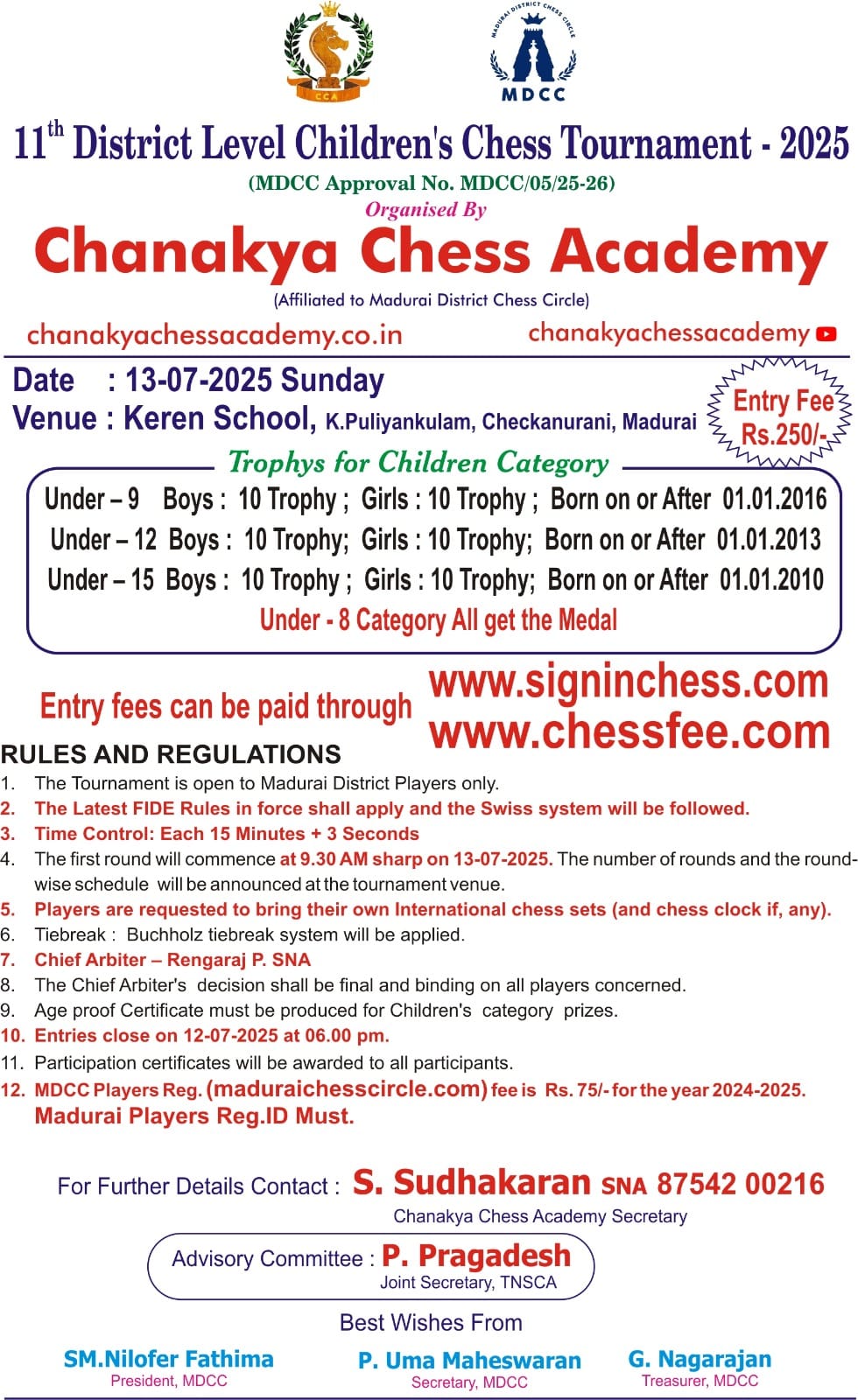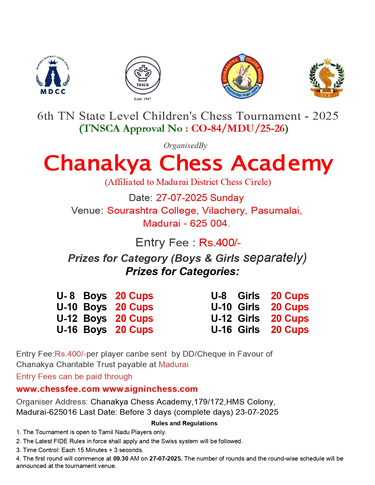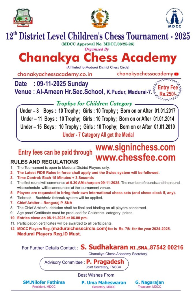 Organized by Chanakya Chess Academy (Affiliated to Madurai District Chess Circle)